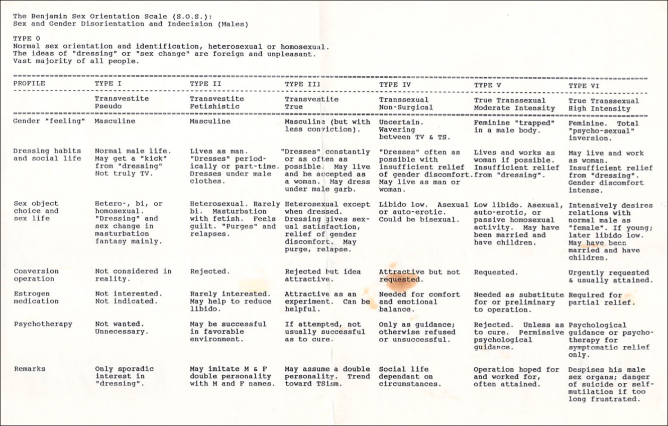A doctor using the Benjamin Scale would first work to understand the patient, their life, and their state of mind, and then classify them into one of the six “types.” Based on that classification, the doctor would determine what the appropriate treatment options might be. For Type V or Type VI patients, often grouped as “true transsexual,” the answer was hormones, surgical procedures, and social role changes that would enable them to live a “normal life.”