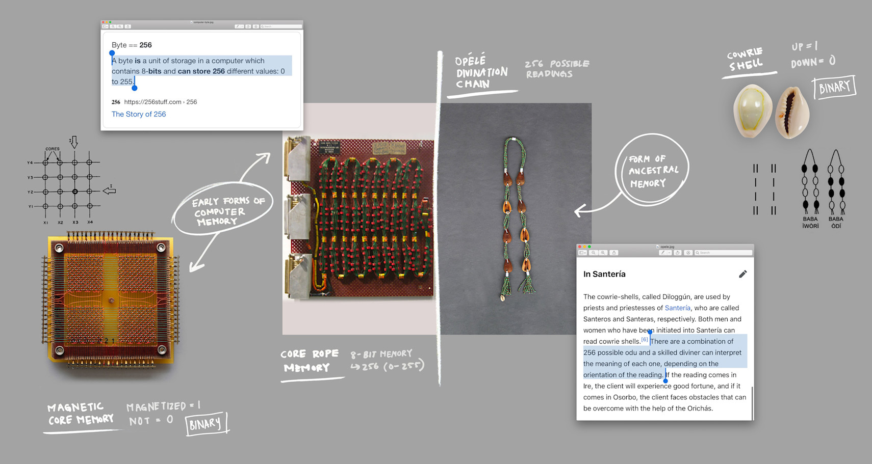 Five years ago was the last time I saw my grandmother. We belong to a nationality within the Nigerian state, the Yoruba, which have an oracle system for divination called Ifá. It materializes through a set of different tools, one of them being a woven chain made of eight similar objects that have two distinctive sides. Originally made of kola nuts, these tools have evolved to make use of other objects like cowrie shells or coconut, primarily due to the transatlantic slave trade and the forced movement of Black people into diaspora. When the chain is tossed by a diviner, a combination of the eight objects facing upwards or downwards results in 256 possible readings of ancestral memories and oracular verses used to decipher past, present and future conundrums of life. This apparatus for divination through collective memory has a binary implementation not unlike the computer byte: a single unit of machine memory that contains eight bits and can store 256 different values (0-255). While computer memory has a finite capacity, the divination chain has boundless potential. It extends itself from a physical mechanism into a field of ritualized practice that has the ability to be recast to unearth an unlimited number of interpretations depending on the context.